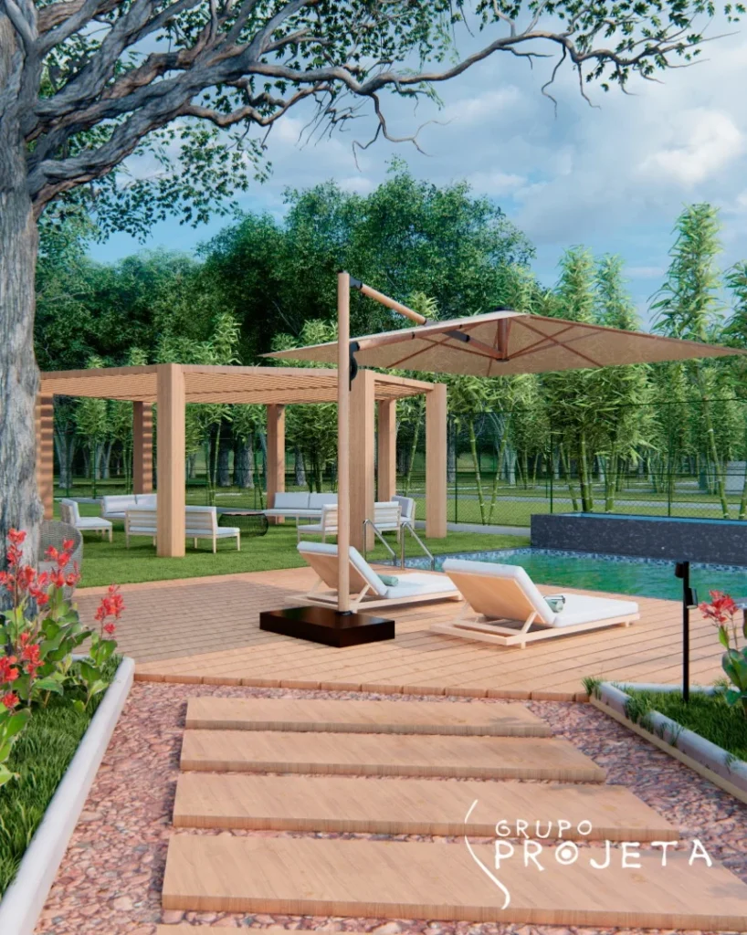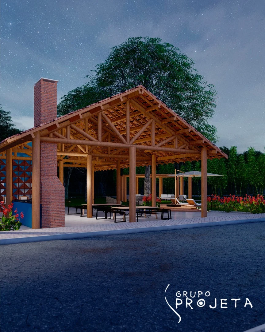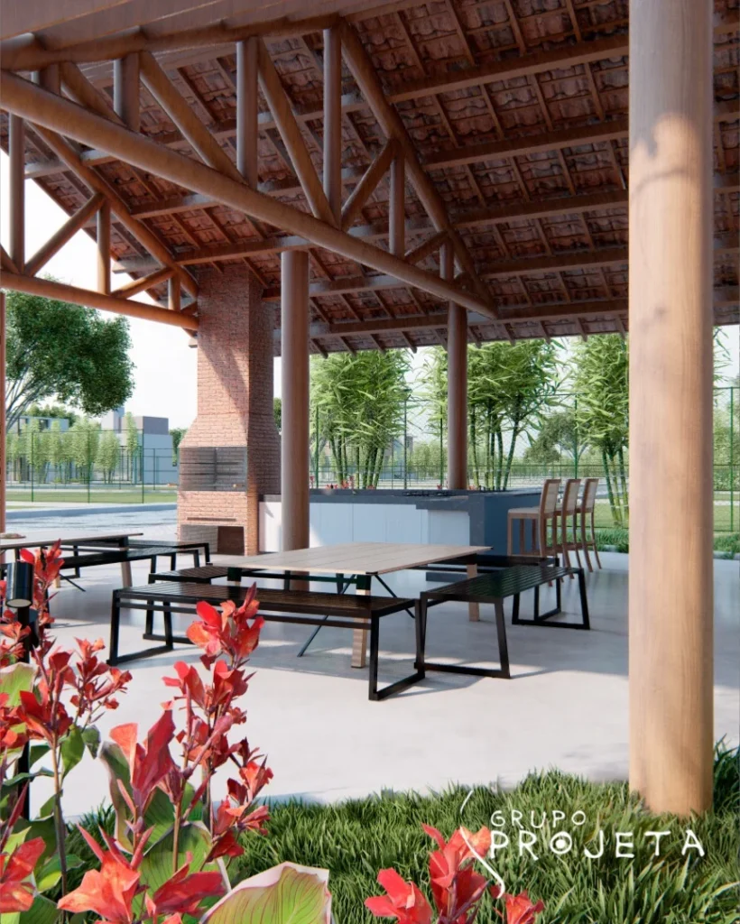 As áreas sociais do Condomínio Residencial Gravatá são verdadeiros clubes privativos, projetados com a assinatura da arquitetura biofílica, integrando o conforto moderno à beleza natural da madeira e da paisagem.